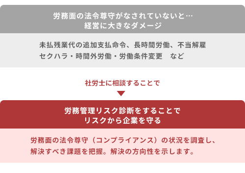 労務管理リスク診断は、このようなリスクから企業を守るために、 労務面の法令遵守(コンプライアンス)の状況を総合的・網羅的に調査し、 解決すべき課題を把握し、解決の方向性を示します。